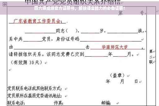 摘要:四六级成绩官方证明书是证明个人英语能力的重要凭证,对于求职、升学、出国等方面具有关键作用。这份证明书能够客观反映考生的英语水平,为各类语言能力和学术能力的评估提供重要参考。拥有此证明书,将为您在竞争激烈的社会中脱颖而出提供有力支持。