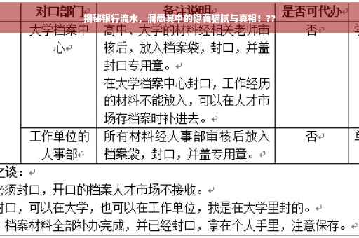 摘要:本文将揭示银行流水中的猫腻,教你如何洞悉其中的秘密。通过深入分析银行流水账单,你将能够识别不正常的交易模式,防范潜在风险。本文将为你提供实用的方法和技巧,帮助你更好地管理个人财务,确保资金安全。