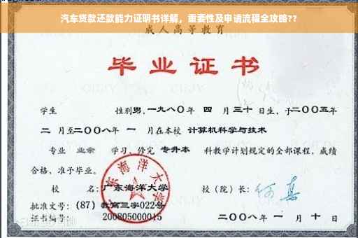 在当今社会,汽车已成为人们生活中不可或缺的交通工具,对于许多人来说,购买汽车选择贷款是一种普遍的做法,在申请汽车贷款时,银行和其他金融机构通常需要借款人提供还款能力证明书,以评估借款人的信用状况和还款能力,本文将详细介绍汽车贷款还款能力证明书的重要性及其申请流程。