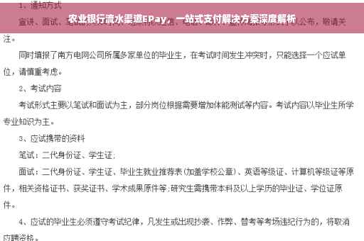 农业银行流水渠道EPay作为一站式支付解决方案,以其安全性高、便捷性强、灵活性高等特点受到了广大商户和消费者的青睐,通过本文的介绍,希望读者对EPay有更深入的了解,从而更好地利用EPay为企业发展助力。