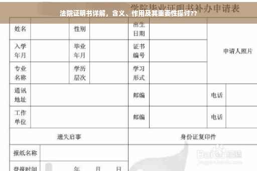 法院出具的证明书是对法律事务的详细解释,它涵盖了事件的背景、过程和结果,具有极高的含义、作用与重要性。证明书能够证明某一事实或行为的真实性和合法性,对于维护社会公正、保障个人权益具有重要意义。它不仅在法律诉讼中作为重要证据,也在日常法律事务中发挥着关键作用,如证明合同的有效性、确认法律关系的存在等。法院出具的证明书是法律领域不可或缺的一部分。
