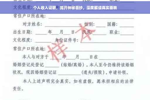 摘要:本文将揭示个人收入证明的真实面貌,消除其神秘性。通过深入了解个人收入证明的内容、作用和重要性,帮助读者理解其含义和用途。本文将介绍如何正确准备和提供个人收入证明,以便在求职、贷款等场合发挥关键作用。阅读本文,你将对个人收入证明有更清晰的认识。