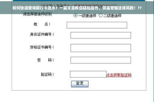 摘要:本文介绍了如何快速查询银行卡流水的方法,但需注意查询银行卡流水涉及到个人隐私问题,不当操作可能涉及违法犯罪问题。在进行查询时务必遵守相关法律法规,确保合法合规操作。文章旨在为读者提供一种便捷的途径来查看自己的银行卡流水记录。
