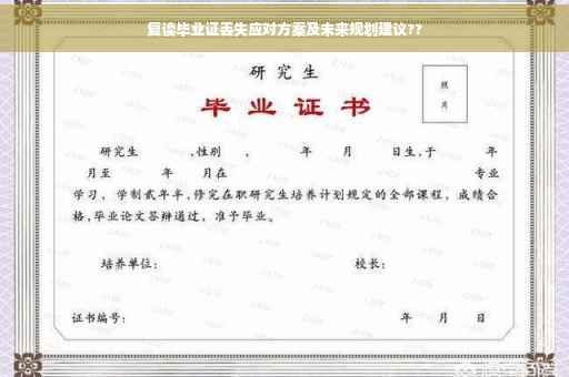 摘要:面对复读毕业证丢失的情况,应对措施包括及时联系学校进行补办或开具证明,确保个人档案完整。保持冷静,寻求家长和老师的帮助。后续规划建议包括评估自身能力和兴趣,选择合适的学校和专业进行深造,制定明确的学习目标和计划,并重视个人兴趣和特长的发展。积极参加实习和社会活动,提升综合素质和竞争力,为未来职业生涯打下坚实的基础。