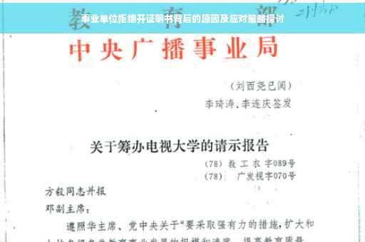 摘要:,,本文探讨了事业单位不同意开证明书的原因及应对策略。事业单位可能因为政策规定、程序限制或资源分配等原因拒绝开具证明书。对此,应对策略包括深入了解相关政策和程序,与事业单位沟通协商,寻求上级部门协助,以及推动事业单位改进服务态度和流程。也需关注事业单位的实际运作情况和内部管理机制,以寻求更合理的解决方案。