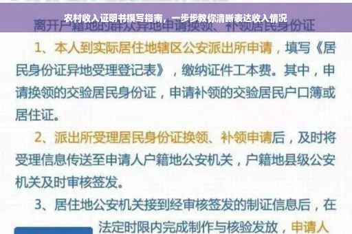 摘要:本指南旨在帮助撰写农村收入证明书,通过清晰的步骤指导,让你轻松完成收入证明的编写。从概述收入证明的重要性开始,逐步介绍如何详细列出收入来源、收入金额及时间跨度等信息。本指南还强调了注意事项和常见问题解答,确保你能够准确、完整地呈现农村收入情况。无论是为了申请贷款还是其他用途,本指南都能为你提供有力的帮助。