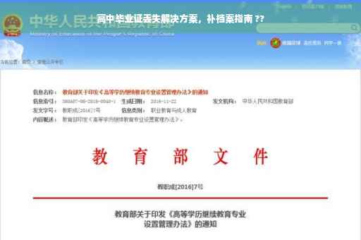 摘要:针对高中毕业证丢失的问题,提供了解决方案。当发现档案中的高中毕业证遗失时,应立即采取行动。联系原高中获取证明文件,如成绩单或毕业证明。向当地教育部门申请补发毕业证,提交必要材料并遵循流程。保留所有相关文件的复印件以备不时之需。提醒毕业生要重视档案保管,以防类似情况再次发生。
