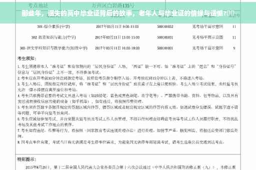 摘要:,,在这篇文章中,我们探讨了关于老年人高中毕业证丢失的故事。这些毕业证是他们青春岁月的见证,也是他们人生旅程中的一部分。然而随着时间的流逝,这些珍贵的证件遗失了,引发了无尽的回忆和感慨。文章通过讲述这些故事,反映了人们对高中毕业证的重要性以及面对遗失时的无奈和遗憾。