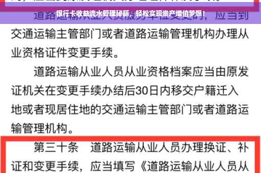 通过遵循以上策略与技巧以及注意事项,你在打理银行卡收益流水时就能更加得心应手,实现资产的有效增值,在这个过程中,不仅要关注金融市场的动态,还要不断学习和提升自己的理财能力,这样才能在复杂的金融环境中稳步前行,祝愿大家都能通过合理的理财规划,实现财富的持续增长。