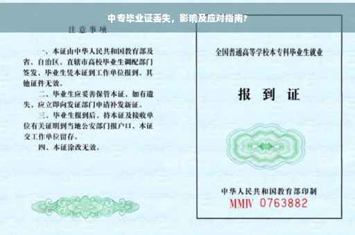 摘要:中专毕业证丢失可能带来一系列影响,如求职、升学等方面的不便。面对这种情况,应对策略包括及时采取措施证明学历,如联系学校开具学历证明或补办毕业证明。保留其他相关证明材料,如成绩单等,以备不时之需。加强个人档案管理意识,避免类似情况再次发生。
