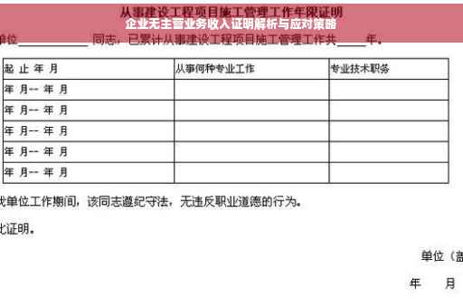 摘要:,,本文将详细解析企业无主营业务收入证明的情况,探讨其成因及影响。为企业提供有效的应对策略和解决方案,包括加强财务管理、调整业务结构、优化市场布局等方面。旨在帮助企业正确应对无主营业务收入证明的问题,确保企业稳健运营与发展。