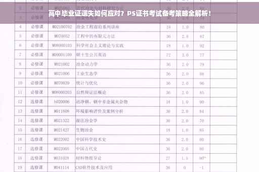 摘要:,,本文将介绍如何应对高中毕业证遗失的情况,并探讨备考PS证书考试的有效策略。针对高中毕业证遗失的问题,我们将提供解决方案和建议,同时强调备考过程中的重点,包括了解考试要求、制定学习计划、充分准备考试内容和提高应试能力等方面。通过阅读本文,读者可以更好地应对高中毕业证遗失的困扰,并成功备考PS证书考试。