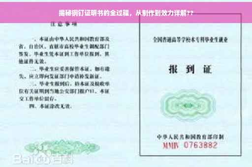 在现代社会,钢钉证明书作为一种重要的工程材料证明文件,广泛应用于建筑、桥梁、道路等基础设施建设领域,它不仅关系到工程项目的安全与质量,更是保障公众生命财产安全的关键所在,本文将为您揭开钢钉证明书的神秘面纱,从制作到效力全过程进行详细介绍,帮助大家更好地了解这一重要证明文件的作用和价值。