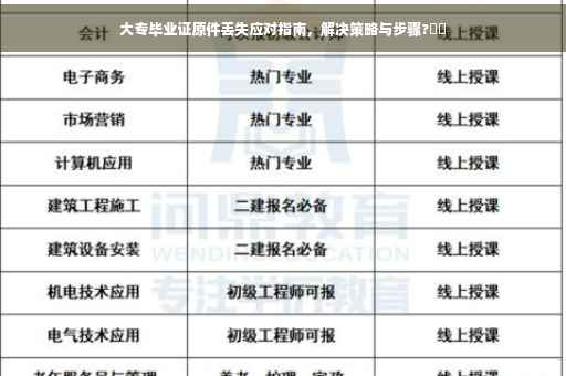 摘要:面对大专毕业证原件丢失的问题,不必慌张。首先应立即联系原毕业学校或相关教育部门,提交补办申请并准备相关证明材料。注意保存好所有与学历证明有关的复印件和电子版文件,以备不时之需。也可通过学信网等在线平台查询并打印学历证明。遵循这些步骤,可有效地应对毕业证丢失问题。