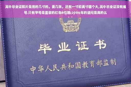 正规的普通高中毕业证(例如:湖北省教育厅统一印制):左半页上方贴有毕业生本人半身免冠二寸照片、下方填写有毕业证书编号(或学籍号+身份证号)和查询网址(湖北教育信息网);右半页上方填写姓名、性别、籍贯、高中学习起止时间,下方盖有校长印章和学校公章,落款是毕业证发放时间(如:二〇〇六年6月30日),在照片右下角压有地市级教育局钢印。【说明】各省市高中毕业证试样不一定一样,建议你到发证学校或学校上级主管教育局查询该生学籍和毕业证存档信息,即可确定真假。可能会是职高的毕业证。