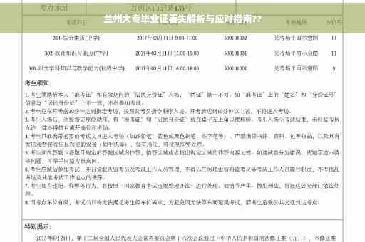 摘要:如果你发现你的兰州大专毕业证丢失了,不必过于担心。你可以通过一系列步骤来应对这种情况。你需要及时前往原毕业学校或相关教育部门进行挂失和备案。按照学校或教育部门的要求提供相关证明文件,如身份证、学生证等,以证明你的身份和学历。等待学校或教育部门的审核和处理,他们会根据你的情况给予相应的解决方案,如补发毕业证等。这是一个需要耐心和时间的过程,但只要你按照正确的步骤操作,最终能够解决毕业证丢失的问题。