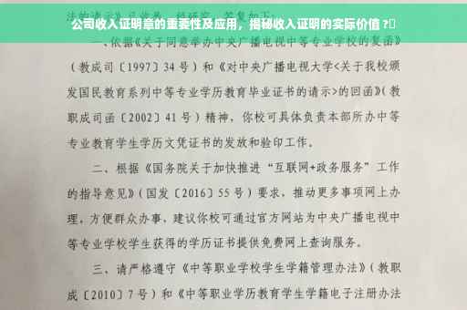 摘要:,,本文将探讨公司收入证明章的重要性及其实际应用。收入证明章作为公司出具的重要文件,对于个人信用评估、贷款申请、租赁房屋等方面具有关键作用。通过本文,读者将了解收入证明章的具体用途、如何正确使用以及其在现代社会中的实际意义。本文还将强调正确使用收入证明章的重要性,以避免潜在的法律风险。