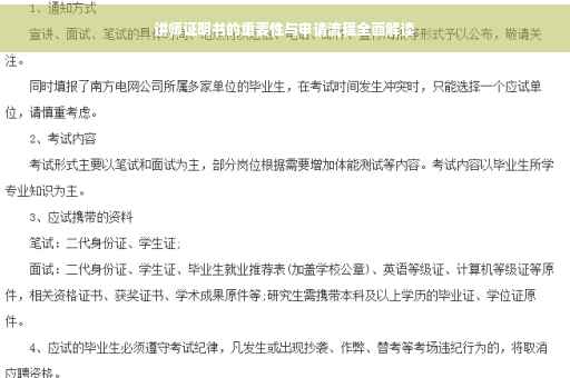 讲师证明书对于提升个人职业竞争力、拓宽职业发展空间具有重要意义,本文详细介绍了讲师证明书的重要性、申请条件、申请流程以及注意事项,希望能够帮助广大教育工作者更好地了解并申请讲师证明书,在申请过程中,申请人应提前了解、准确填写信息、准备好申请材料、参加培训和考试、保持沟通等,以提高申请成功率。