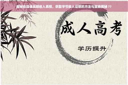 摘要:本文将揭示自媒体收入的真相,探讨如何获取高额字节收入证明。通过深入了解自媒体行业的盈利模式、收入来源以及提升收入的方法,帮助读者了解如何在这个行业中取得成功并获得高额收入。本文将介绍一些有效的策略和技巧,帮助自媒体从业者提高收益并实现财务目标。