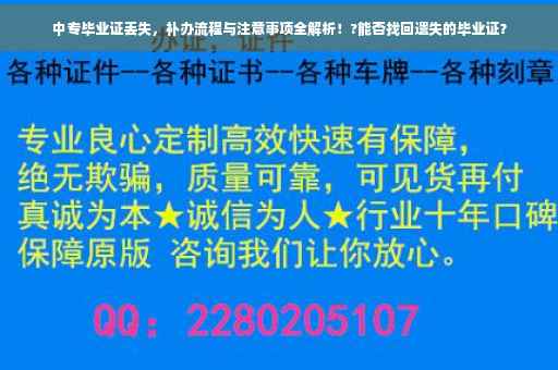 关于中专毕业证丢失能否补回及补办流程与注意事项的摘要:,,中专毕业证丢失可补回,但具体流程因地区和学校而异。补办需准备相关证明材料,如身份证、学历证明等,并前往原毕业学校或教育部门申请办理。补办过程中需注意保存好所有证明材料,遵守申请时限,确保信息真实准确。补办毕业证需一定时间,请提前做好准备。中专毕业证丢失后应及时按规定流程进行补办,以确保个人权益。