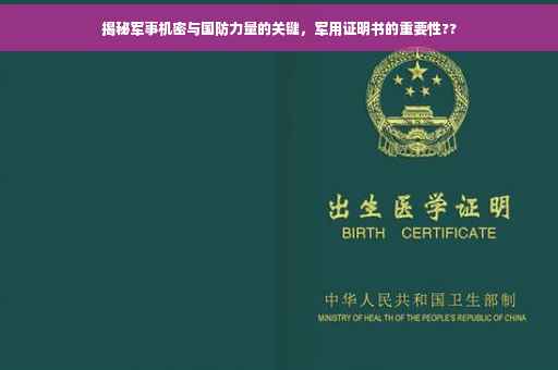军用证明书作为军事机密与国防力量之间的纽带,在维护国家安全、促进军队内部管理、支持国防科研与生产以及军事外交与合作等方面发挥着重要作用,通过深入了解军用证明书的含义、作用及重要性,我们不禁感叹这一神秘而又重要的文书在军事领域中的价值,随着时代的进步和军事科技的发展,军用证明书的作用将更加凸显,为国家的安全稳定作出更大的贡献。