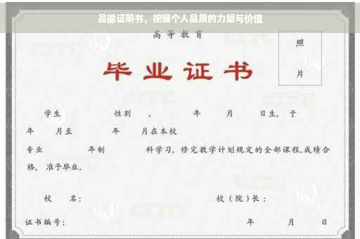 摘要:,,品德证明书是一份证明个人品质的文件,旨在探索个人品质的力量与价值。它涵盖了诚实、尊重、责任感、同情心等品质的表现,强调个人品德的重要性。通过品德证明书,人们可以更好地认识自己,发现自己的优点和不足,进而提升自我修养和成长。这份证明不仅对个人成长有着重要意义,也对社会和谐与文明进步起到积极的推动作用。