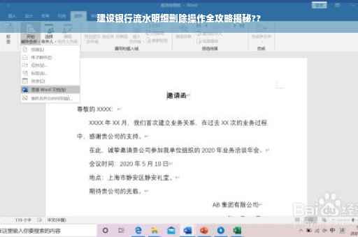 摘要:本文将为你详细介绍建设银行流水明细的删除操作全攻略。通过本文,你将了解到如何轻松删除建设银行流水明细,让你更好地管理个人财务记录。无论你是个人用户还是企业用户,本文都能为你提供实用的操作指南。阅读本文,你将掌握建设银行流水明细删除的方法和步骤,让你的财务记录更加清晰明了。