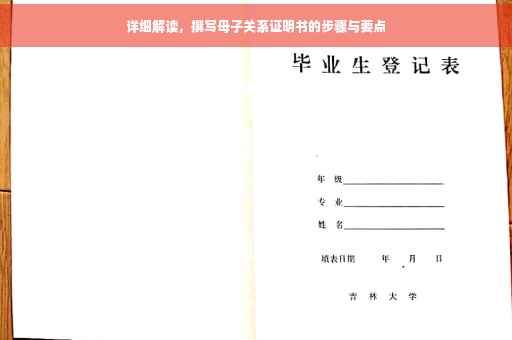 摘要:,,本文将详细解读如何撰写母子关系证明书。明确证明书的目的和意义,用于证明母亲与子女之间的亲属关系。介绍撰写证明书的步骤和要点,包括准备相关证明材料,如身份证、户口本等。阐述证明书的撰写要点,包括双方信息、关系描述、证明事项等。强调证明书的真实性和法律效力,确保信息的准确性和完整性。本文旨在帮助需要撰写母子关系证明书的人快速了解撰写流程和注意事项。