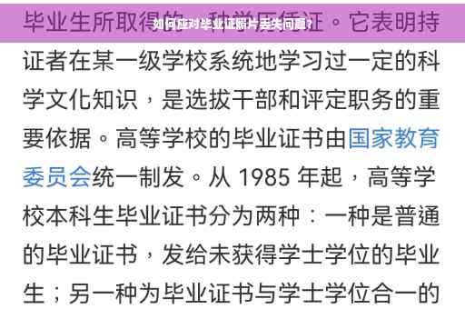面对毕业证照片丢失的情况,我们要保持冷静,及时联系相关部门,准备好相关证明材料并按照流程解决问题,我们也要加强个人证件管理意识,做好防范工作以避免类似情况再次发生。