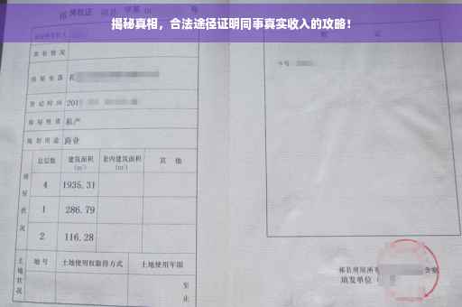 摘要:本文将揭示合法证明同事真实收入的真相。通过合法途径,如了解税务政策、查询工资条、参考行业薪酬标准等,教你如何巧妙获取同事收入信息。强调尊重他人隐私和遵守职业道德的重要性,确保在合法范围内获取收入证明,避免侵犯他人权益。本文旨在提供合法途径,帮助你在需要证明同事收入时,既能满足需求又不越界。