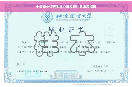 摘要:中专毕业证丢失,需及时补办以免影响个人职业发展。补办流程包括向原毕业学校或当地教育部门申请,提交相关证明材料并填写申请表格,缴纳相应费用。在补办过程中,需注意保存好相关证明材料,确保信息准确无误,注意时间节点及时限。补办时需谨慎,避免影响个人前途。