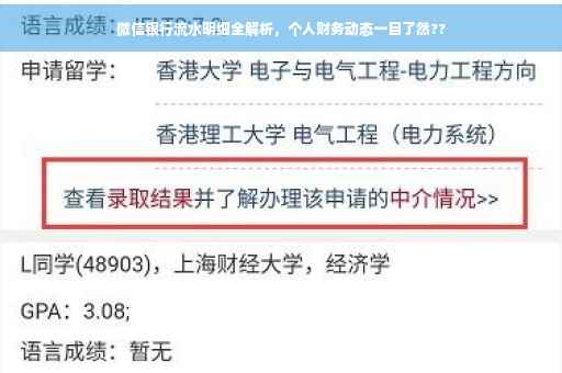 摘要:通过微信,你可以轻松查看银行流水明细,全面解析个人财务动态。这项功能让你随时随地掌握自己的财务状况,方便管理个人财务。无论是收入还是支出,都能一目了然,帮助你更好地规划个人财务计划。微信查看银行流水明细,让你的财务生活更加便捷、高效。