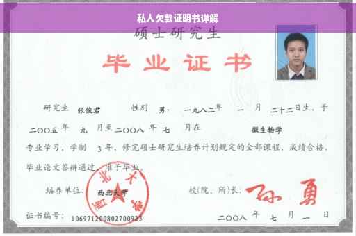 摘要:私人欠款证明书是一份重要的文件,用于证明个人之间的借贷关系。该文件详细记录了借款人、贷款人、借款金额、借款日期等关键信息。通过这份证明书,双方可以明确权益和义务,确保借款的合法性和有效性。对于借款人和贷款人来说,私人欠款证明书具有法律效应,有助于维护双方的合法权益。