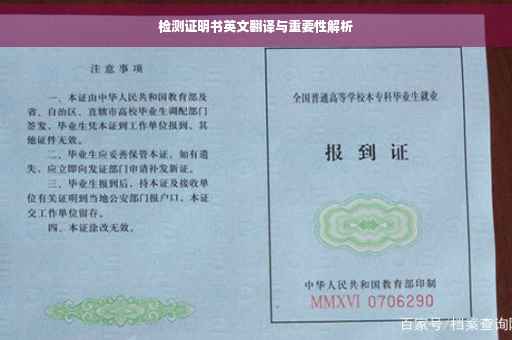 摘要:,,本文介绍了检测证明书的英文翻译及其重要性。检测证明书是一种重要的文件,用于证明产品或服务的质量和性能,促进国际贸易和合作。正确的英文翻译对于检测证明书的国际流通至关重要,能够确保信息的准确传递和有效沟通。检测证明书的重要性在于它能够提供可靠的依据,帮助消费者做出明智的购买决策,并为企业树立良好的信誉和形象。准确翻译和重视检测证明书对于国际间的经济合作和发展具有重要意义。