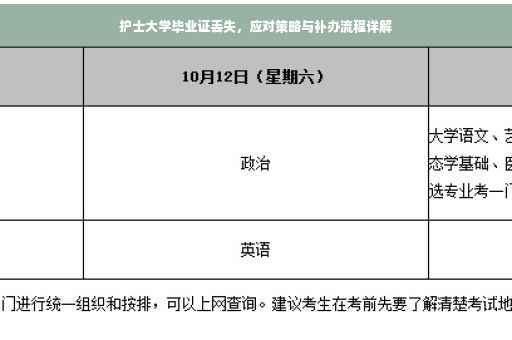 摘要:护士大学毕业证丢失,不必过分担忧。应对策略包括及时挂失并报警,确保个人信息不被盗用。补办流程一般包括以下步骤:前往原毕业学校教务处或学生处申请补办,提交相关证明材料如身份证、学历证明等,填写丢失证书的相关申请表格,缴纳相应费用,等待审核及领取新的毕业证书。及时行动,遵循学校规定,可顺利解决问题。