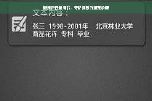 健康责任证明书,是一份关乎个人健康与社会责任的庄严承诺,在当前社会,随着生活节奏的加快和工作压力的增大,人们的健康状况日益受到关注,健康责任证明书的出现,不仅是对个人健康状况的确认,更是对社会的一种责任与担当,本文将围绕健康责任证明书的重要性、作用、办理流程及其意义展开阐述,以唤起大家对健康的重视,共同营造健康的生活环境。