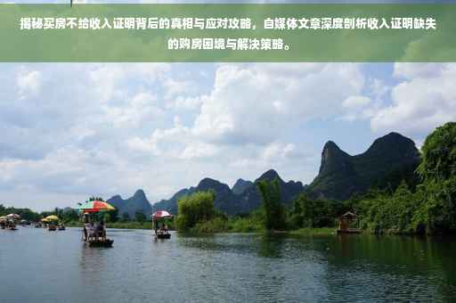摘要:本文将揭示买房不给收入证明背后的真相和应对策略。通过自媒体文章的形式,探讨在购房过程中没有提供收入证明所带来的影响,同时分享如何应对这一情况的方法。文章旨在帮助购房者了解相关规定和注意事项,避免在购房过程中遇到不必要的困扰。通过本文,读者可以了解到如何应对买房不给收入证明的问题,确保购房过程的顺利进行。