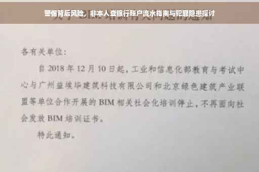 摘要:关于非本人如何查银行账户流水的问题,需警惕背后潜藏的法律风险与犯罪隐患。未经授权查询他人银行账户流水涉嫌侵犯他人隐私,可能触犯相关法律法规。建议通过合法途径获取相关信息,如委托授权或依法申请。保护个人隐私,远离非法行为。
