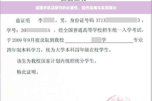 摘要:随着智能手机的普及,定期清理手机证明书变得至关重要。手机证明书是手机正常运行的关键证明,清理不当可能导致手机性能下降或安全隐患。本文旨在强调清理手机证明书的必要性,并提供详细的操作指南,帮助用户轻松完成清理过程,确保手机正常运行。通过遵循指南,用户可以保护手机安全并延长使用寿命。
