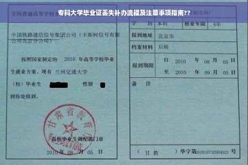 摘要:专科大学毕业证丢失,需及时补办。补办流程包括联系原毕业学校教务处或学籍管理部门,提交相关证明材料如身份证、学历证明等,并按要求缴纳相关费用。注意事项包括尽快行动,避免拖延导致补办困难;妥善保管好个人证件及证明材料,防止丢失或损坏;了解补办时限和费用,做好充分准备。