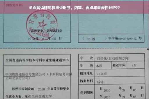 摘要:,,本篇内容全面解读了肺部检测证明书,详细介绍了证明书中的内容,包括各项指标及其意义。对如何解读这些指标进行了简要说明,帮助读者理解各项指标所代表的健康状况。文章还强调了肺部检测证明书的重要性,提醒人们定期进行肺部检查,及时发现并预防肺部疾病。