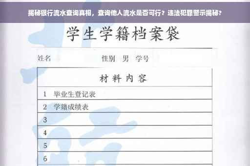 摘要:本文将揭示银行流水查询的真相,解答公众关于能否查询他人银行流水的疑问。明确指出查询他人银行流水属于违法犯罪行为,涉及侵犯他人隐私和违反相关法律法规。提醒广大公众要遵守法律法规,切勿尝试查询他人银行流水,以免陷入法律困境。