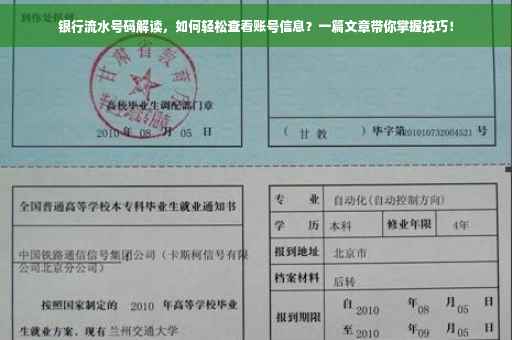 摘要:本文将介绍如何通过银行流水号查看账号,内容简洁易懂,适合广大读者阅读。文章首先解释了什么是银行流水号,然后详细阐述了如何通过流水号查询账户信息的方法,包括步骤和注意事项。文章总结了掌握这一技能的重要性和便捷性。通过本文,读者可以轻松掌握如何通过银行流水号查看账号的技巧,避免相关困扰。