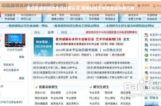 三种。西南科技大学的毕业证书含金量非常高,西南科技大学(Southwest University of Science and Technology)简称“西南科大”,坐落于中国科技城-四川省绵阳市,由教育部、国家国防科技工业局和四川省人民政府共建,是西部重点建设十四所高校之一,是四川省全面创新改革试验定点联系高校之一,入选国家“中西部高校基础能力建设工程”、四川省“双一流”建设计划、教育部卓越工程师教育培养计划、“双万计划”、国家级大学生创新创业训练计划、国家级新工科研究与实践项目、四川省卓越法律人才教育培养计划、四川省卓越农林人才教育培养计划、四川2011计划。