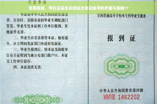 摘要:学位证丢失后,找回毕业证编号的方法包括联系毕业学校教务处查询档案,获取编号信息。登录学信网进行在线验证,打印学历证明作为辅助材料。补办证明文件也是解决方案之一,需前往学校相关部门申请。本文提供全面指导,助您解决毕业证编号丢失问题。