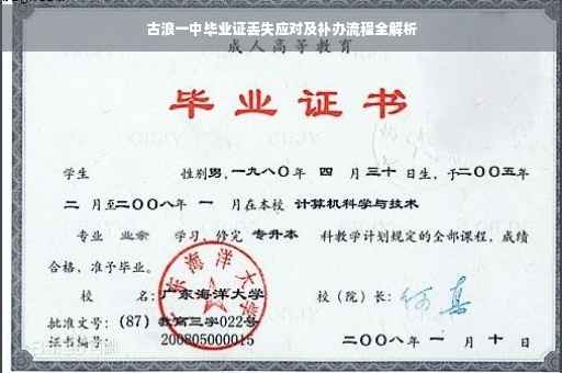 摘要:古浪一中毕业证丢失,可按照以下应对措施与补办流程操作。及时在学校官网或相关部门发布丢失声明,避免证件被非法利用。前往学校教务处或学籍管理部门进行补办申请,提交相关证明材料如身份证、学籍信息等。按照学校规定的流程进行审批和审核,最后成功补办毕业证。整个过程需留意时间节点,确保及时补办,避免影响个人前途。