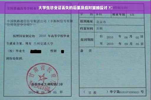 2、提高警惕:在毕业季等高峰期,特别要注意证件的安全,此外为了预防万一可以将证件存放位置告知家人或朋友以便在遗失时能够及时寻找或求助,同时提醒身边的同学和朋友加强证件管理避免类似情况发生,我们不仅要自己做好证件管理也要关心提醒身边的人共同防范避免不必要的损失和困扰。 ,大学生毕业证丢失可能会带来一系列严重后果包括影响就业阻碍深造和心理影响等因此大学生应加强对个人证件的管理并妥善保管好毕业证书等重要证件如果不幸丢失应及时采取措施进行补救同时进行心理调适积极面对挑战采取预防措施避免类似情况再次发生并提醒他人加强证件管理共同防范风险。。