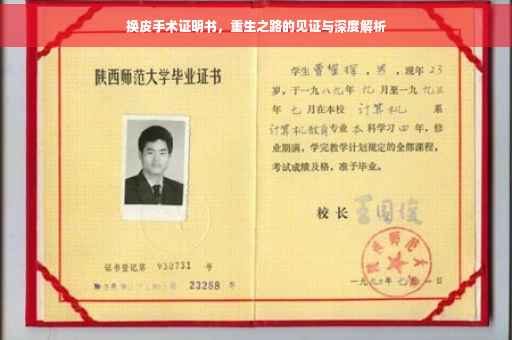 摘要:本证明书是关于换皮手术的详细记录与解析,见证了重生之路的奇迹。通过本次手术,患者成功重塑肌肤,重拾自信。本文详细描述了手术过程、术后恢复及效果评估,并深入解析了手术的重要性及其对患者生活带来的积极影响。此次换皮手术不仅证明了现代医学技术的先进性,更为患者带来了新生。