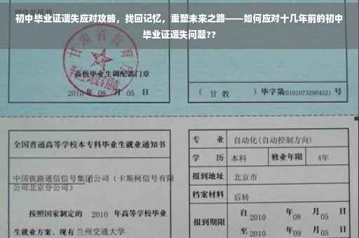摘要:初中毕业证遗失不必慌张,可以按照攻略找回记忆并重塑未来之路。前往原毕业学校或当地教育部门咨询相关证明文件,如毕业证明或成绩单等。准备身份证明、照片及其他必要材料申请补办。注意保存好相关证明材料,以备不时之需。补办流程可能因地区而异,建议提前查询当地政策和流程。虽然初中毕业证遗失可能会带来一些不便,但只要积极应对,仍有机会重塑未来之路。