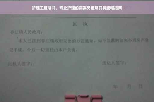 摘要:护理工证明书是专业护理领域的真实见证,其开具过程严谨且重要。通常需要护理工作者在医疗机构完成一定时长的护理工作实践,并由机构负责人或相关管理部门出具证明书。内容包括护理人员的姓名、职务、工作时长、实践表现等,以证明其在护理领域的专业能力。这一证明对于护理人员的工作评价、职业发展具有重要意义。